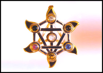 Large 18kt yellow gold and sterling 3D Healing Star amulet set with 14 precious gemstones on both front and back.