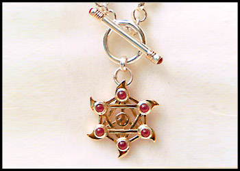 Small 14kt rose/yellow gold Peace Star with 6 , 3mm rubies set in sterling bezels. |