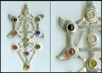 Large sterling 3D hinged Tree of Life amulet set with 13 semi precious gemstones on both front and back.